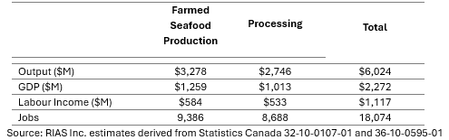 18,074 full-time jobs in the sector, with 9,386 in primary production and 8,688 in processing. Almost three-quarters of total employment is in the farm-raised salmon sector, with 13,242 (FTE’s) in 2024. Labour income was $1.1billion.