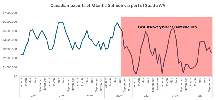 Farm closures in BC have made it difficult for producers to ensure reliable year-round supply of fresh fish. Since the 2023 Discovery Island farm closures, producers in BC have been losing market share in key export markets, including the US, Japan and China, as they have struggled to maintain year-round supply, which is a key requirement of many foreign buyers (link). As recently as 2022, fresh, farm-raised salmon was BC’s largest agri-food export and now, there are months where exports drop to near zero.